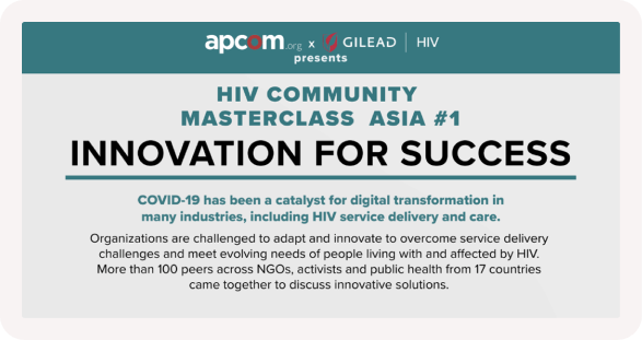 One silver lining is that decades of experience from the HIV/AIDS epidemic offers valuable insights for fighting COVID-19 and vice versa. In view of this opportunity for learning, Gilead and APCOM Foundation have come together to host a virtual HIV Community Masterclass Series for communities in Asia Pacific to share their experiences and exchange best practices. These interactive sessions presented a unique opportunity to hear from leading experts, share local perspectives and learn from peers in the HIV space in Asia.